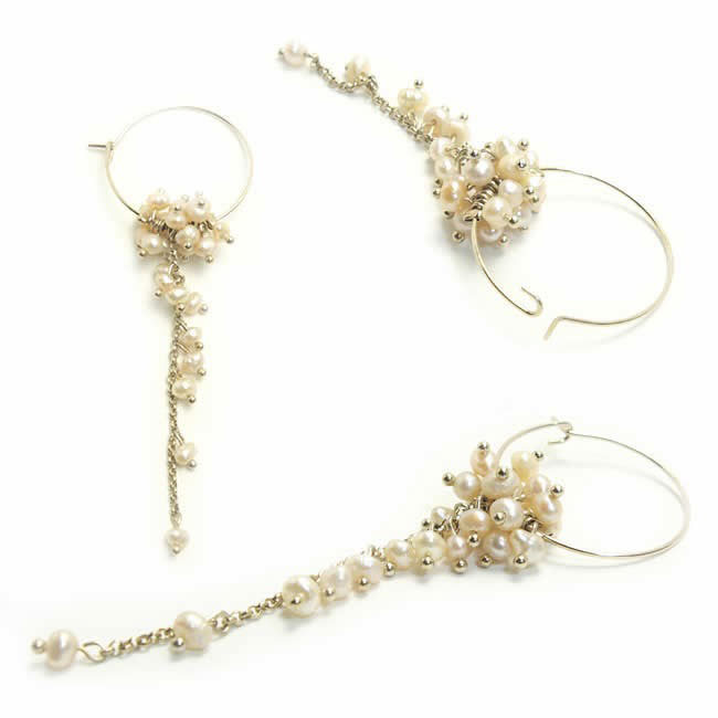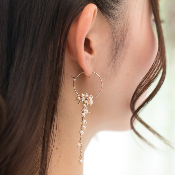 フープピアスとチェーンに淡水パールを散りばめた華やかなロングピアスです。