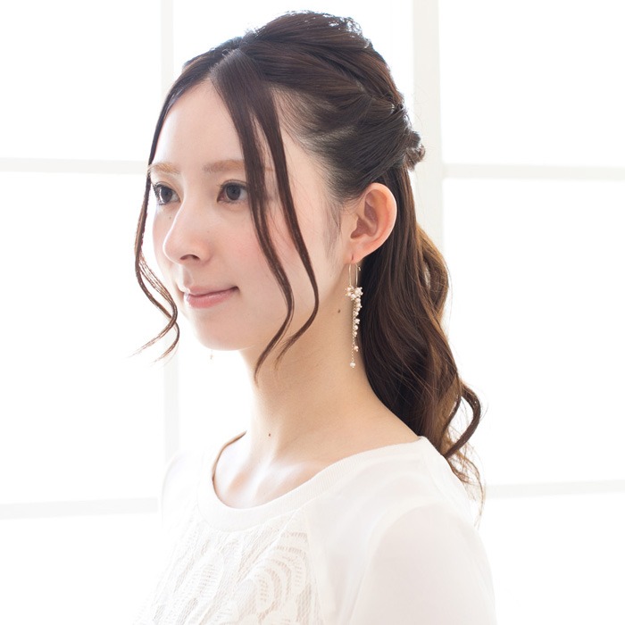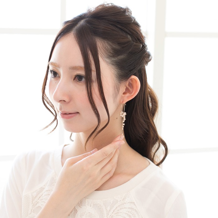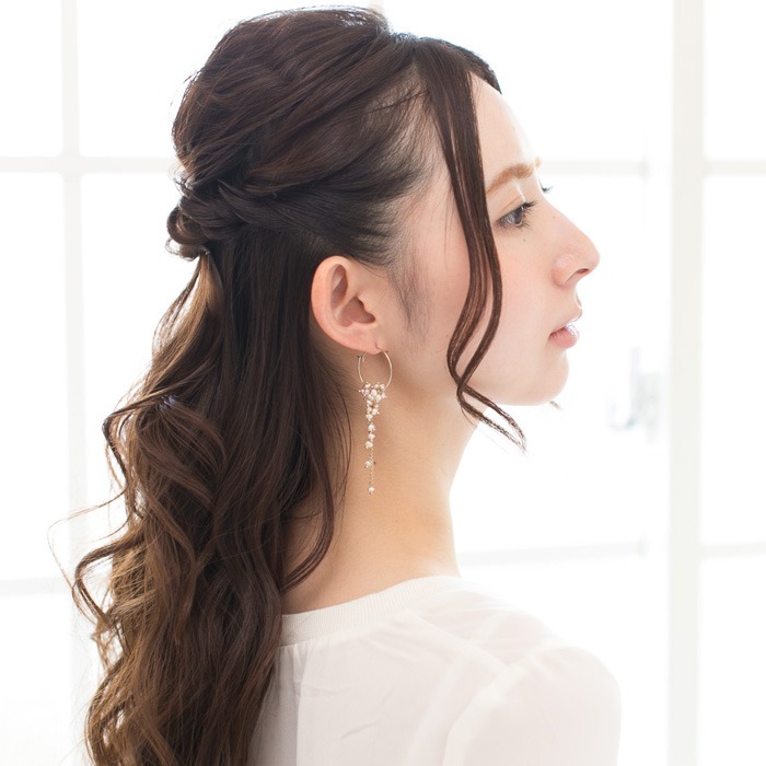 チェーンとあわせることによって生まれたこぼれおちるようなデザインは、バックスタイルも綺麗にみせてくれるので、ハーフアップにして髪の毛を後ろに流すとフェイスラインがスッキリ見えます。