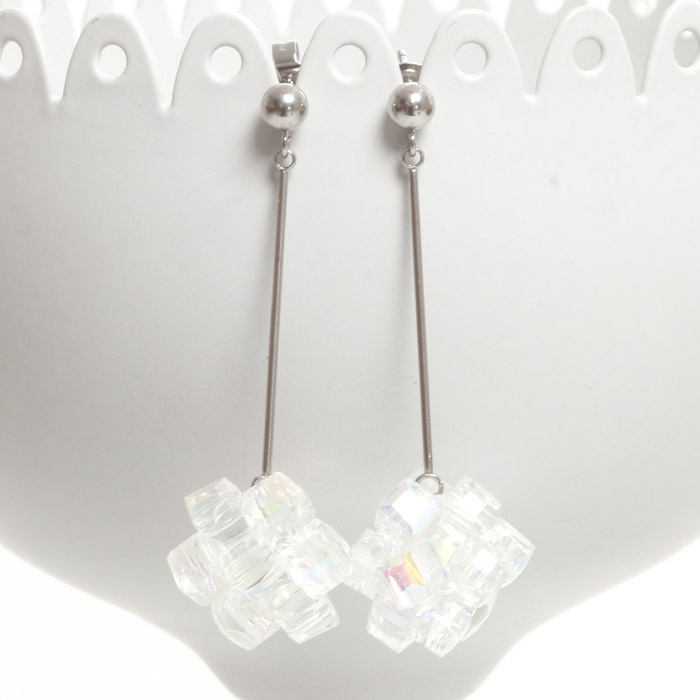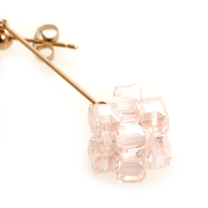 シンプルな4mmボールのついたスタッドピアスにスティックをつけ、キラキラしたビーズを使ったお花をぶら下げました。お花がちょうど顎のラインにくるので嬉しい小顔効果も。