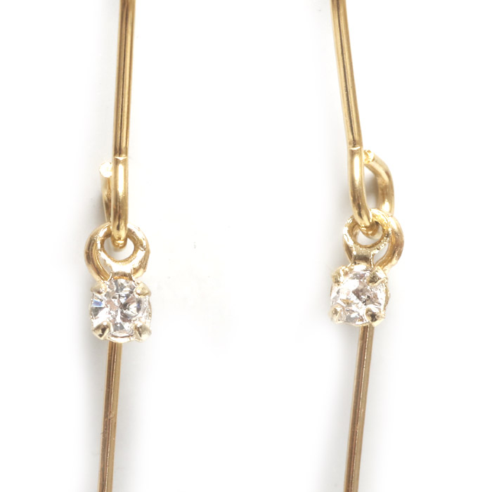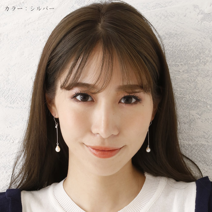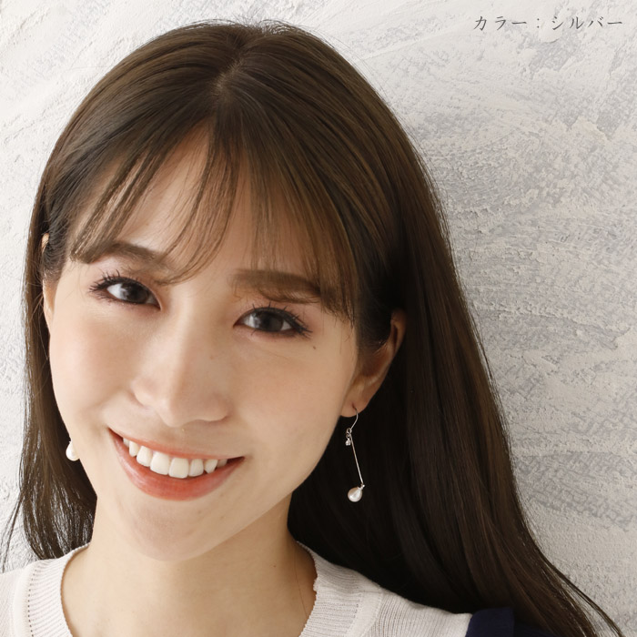 スティックの上部には小さなジュエルが揺れてキラキラと輝きます。まっすぐに伸びたステックはフェイスラインをきゅっと引き締めてくれる効果も。約7mmの淡水パールは口元で揺れてワンポイントに♪
